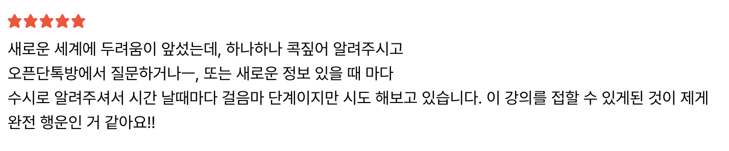 정말 이런 강의는 처음이에요 👍🏻 어쩜 이렇게 친절하시고 다 쏟아주시는지 ~사람마다 받아들이는 능력마다 차이는 있겠지만 차근차근 해 나갈수 있을것 같아 설레이는 강의 입니다 .도전할 용기가 생겨 참 감사합니다 👏👏👏