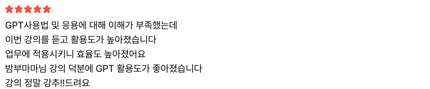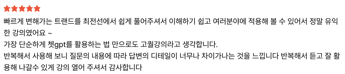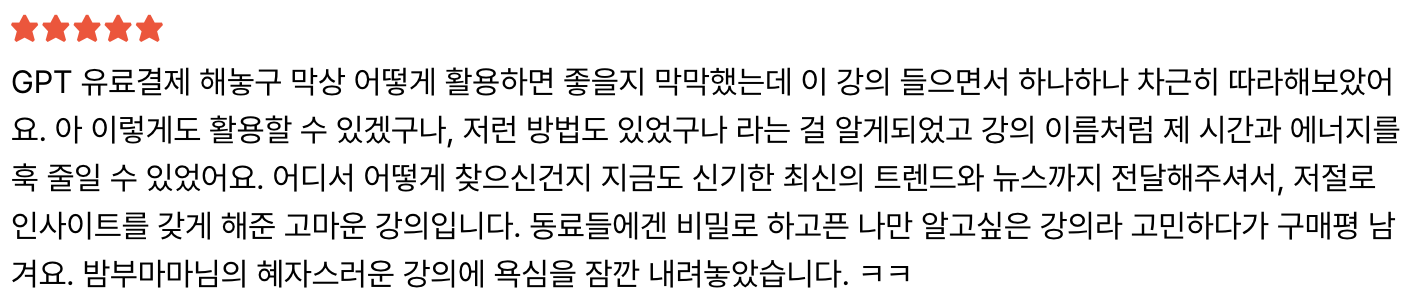 진짜 저만 알고싶은 강의에요..! gpt한창 유행하고 여기저기 전자책 나올때 고민하다가 밤부마마님 강의를 택했는데 그 어떤 전자책, 강의보다 가장많은 인사이트를 담고있어요. 정말 공부한 것들을 저희에게 액기스만 쫙쫙 뽑아서 전달해주시니 여태 들은 강의중에 가장 새롭고 재밌었어요! 널리널리 알려지면 안되는데.. 싶은마음.. ㅋㅋㅋㅋ 진짜 들어보면 후회 안하는 강의 👍 두말하면 입아파요